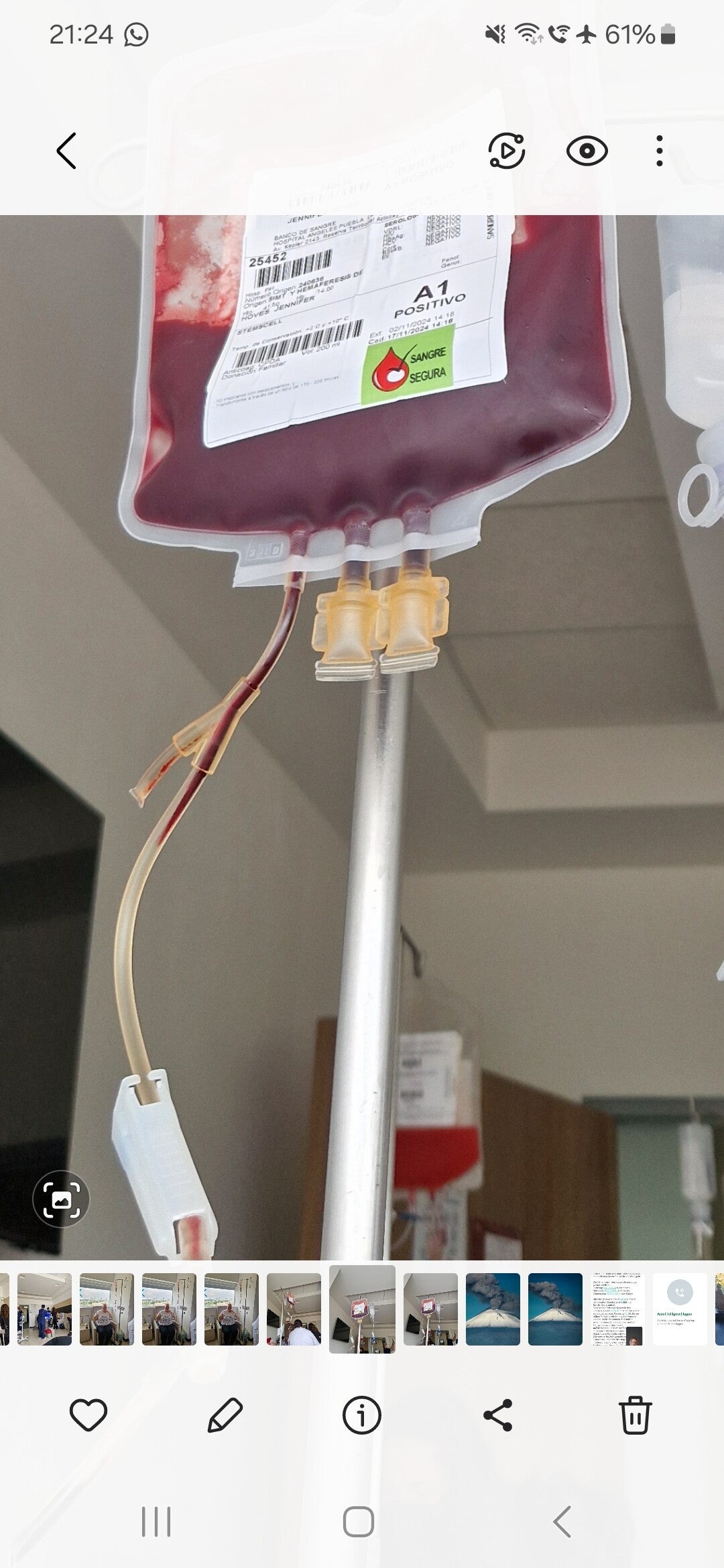 Im Krankenhaus angekommen ging es mir kreislaufmäßig richtig schlecht. Ich dachte ich könnte noch stehen, als meine Schwester mir sagte das ich schlagartig Gesichtsfarbe verliere.....๐๐ณ๐คฆโ๏ธ๐คฃJa, sie hatte recht, sie musste mich vor dem Aufzug festhalten, weil ich weggekippt bin๐ฌ. So mich schnell im Rollstuhl gesetzt, ging es zum Stockwerk 2...... So ein riesiges Krankenhaus. Dr.Carlos und Dr.Max erwarteten uns schon und jeder durfte sich auf seinen markierten Platz setzen. An dem Platz stand ein Infusionsständer mit meinem Namen๐ณ๐ต๐ซ, ok gleich steigt die Party ๐ช๐ฅณ. Die Ärzte und Krankenschwestern verkabelten uns und wir bekamen alle unsere Stammzellen auf dem Infusionsständer gehangen ๐ฅฐ das war ein schöner aber auch gruseliger Anblick ๐ค. Als mein Blick so durch das Zimmer wanderte, stellte ich fest, was alle Menschen sammt für verschiedene Blutfarben hatten. Annekens Blut leuchtete wie der Regenbogen ๐ und meins war dunkel Rot, wie eine reife kirsche ๐. Als wir unsere Stammzellen zurück hatten, hatte ich noch ein Date wegen meiner Fistel. Weiterhin Medikamente und Schmerztabletten......Dr.Max war so freundlich uns zu begleiten.